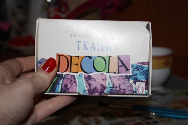 Вначале я попробовла краску в незаметном месте.Полосочка-это акрил по ткани DECOLA .Кружок непонятного цвета -краска для самшевой обуви SALTON .