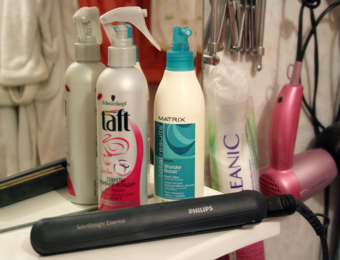 У меня есть термозащита от Taft. Признаюсь, что использую ее крайне редко. Как правило я сушу волосы сразу после душа завернуиая в полотенце, и когда распыляю спрей он попадает на плечи и мне становится неприятно холодно. Поэтому собственно я использую ее крайне редко.