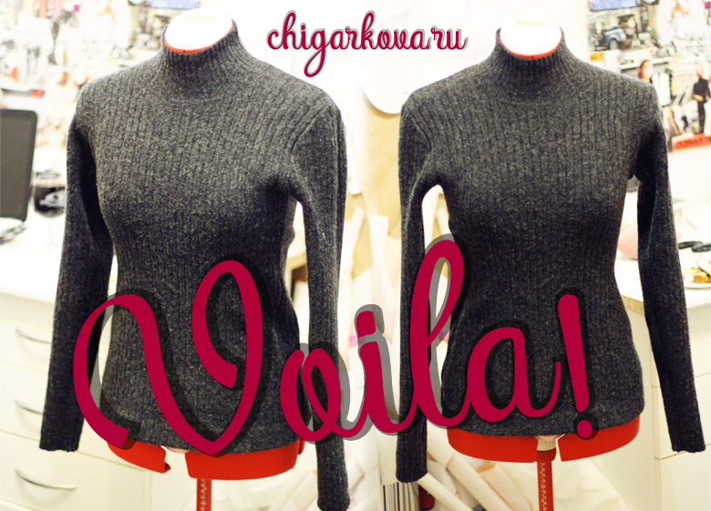 Поэтому пришлось перешивать все плечевые швы, боковые швы, рукава и длину изделия. Но цвет, фактура и качество были такие чудесные, что не переделать эту водолазку для дальнейшей эксплуатации было просто нельзя.
