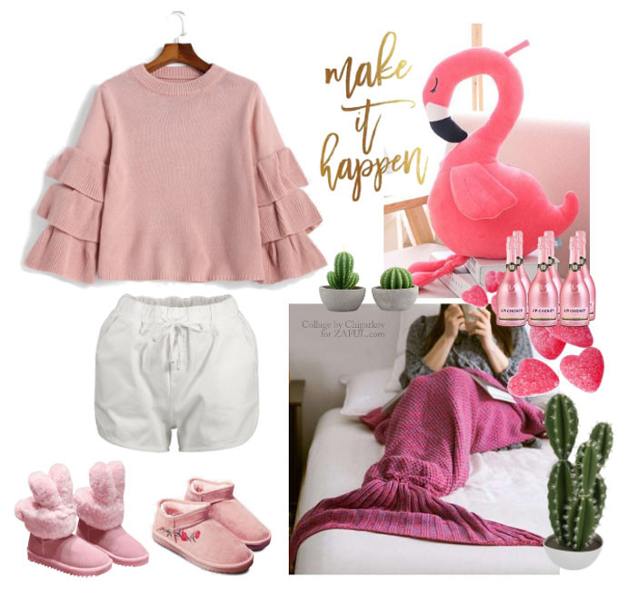 | Свитер, шорты, угги с ушками, короткие угги. Игрушка фламинго- тут; плед в виде хвоста русалки- тут. |