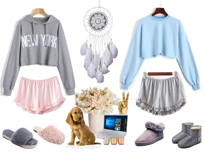 Комплект слева: толстовка Ney York, шортики, тапочки и тапочки; комплект справа: голубая толстовка, шортики, короткие угги с мехом, блестящие угги. Ловец снов.