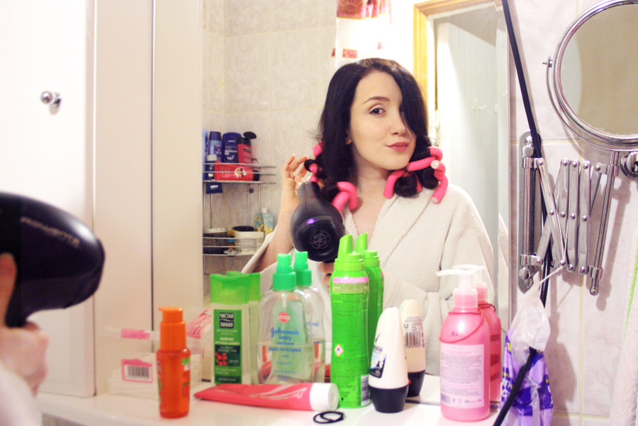 1. Помыть голову, походить немного в полотенце, сделать с волосами все ваши традиционные ритуалы. Я хожу в полотенце минут десять, потом разматываю его, поворачиваю сухой половинкой и хожу еще пять, поэтому волосы на момент фена у меня практически сухие. Я не люблю сушить их когда они еще очень мокрые- пустая трата времени, это очень долго.