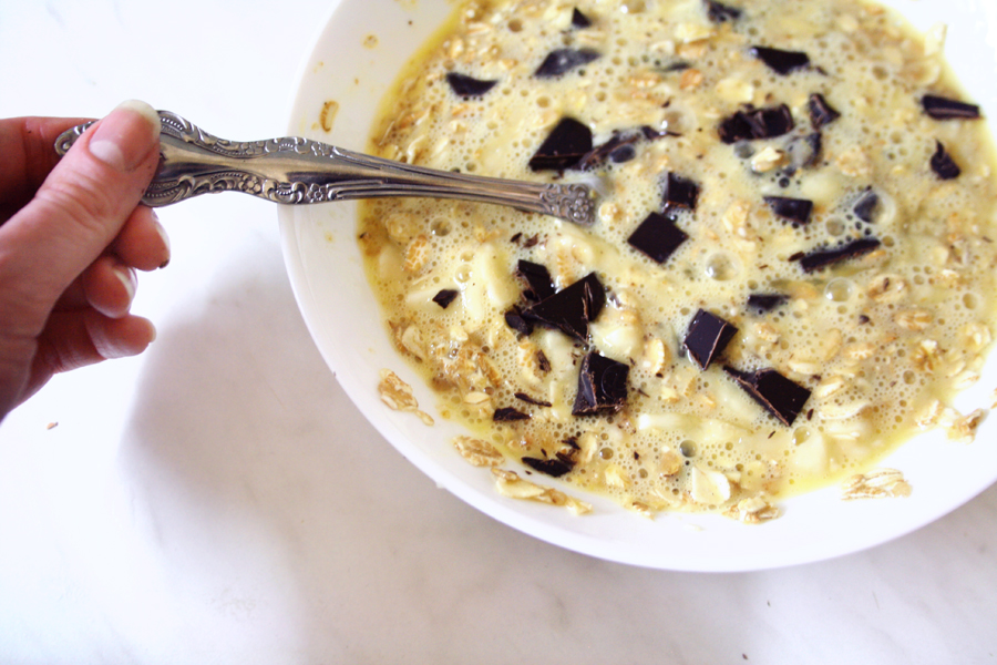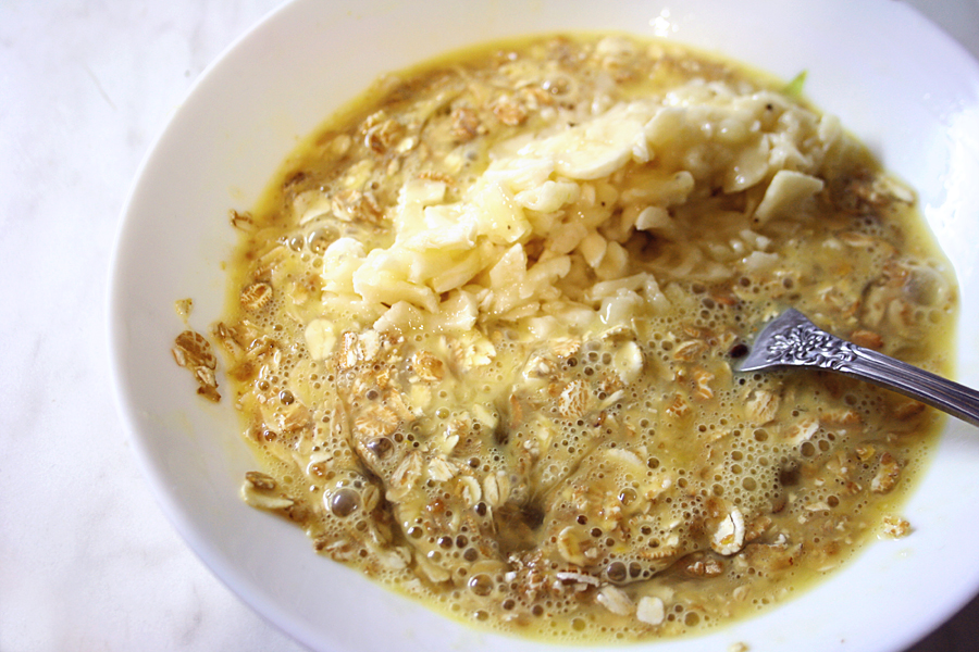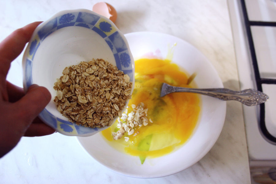 Разбиваем яйца и смешиваем их с овсянкой.
