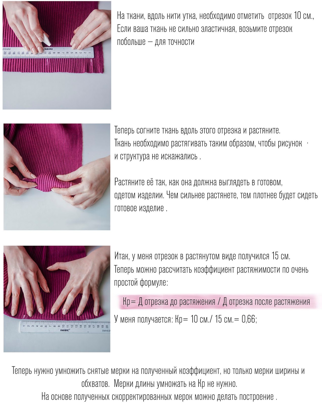 При пошиве изделий из трикотажа, которые должны плотно облегать фигуру, такие как белье, купальники, лосины, одежда для спорта и т.п. обычных мерок недостаточно. Для их построения необходимо учитывать коэффициент растяжимости трикотажа. Для каждой ткани он будет разным.